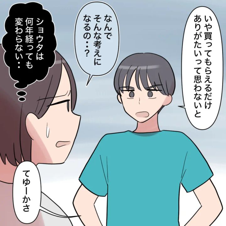 「いや買ってもらえるだけありがたいって思わないと」と言い出し、「なんでそんな考えになるの・・?」と言いながら「ショウタは何年経っても変わらない・・」とドン引きする私に、「てゆーかさ」