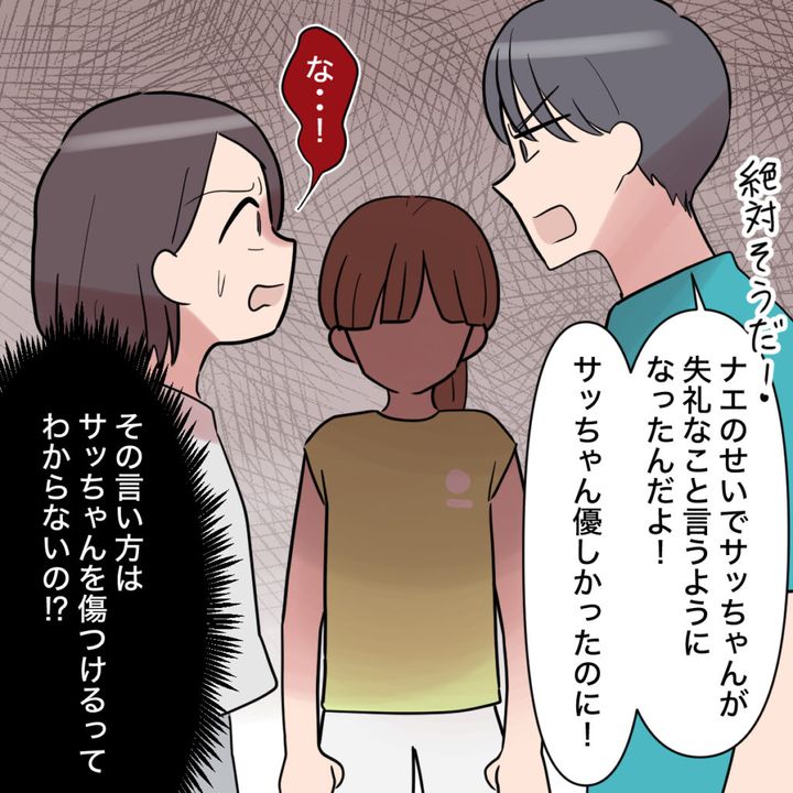 「絶対そうだ!ナエのせいでサッちゃんが失礼なこと言うようになったんだよ!サッちゃん優しかったのに!」と決めつけて言い出すショウタ。「な・・!」と言いながら、「その言い方がサッちゃんを傷つけるってわからないの!?」と心の中で思っていた私。その近くにはサッちゃんが立っていたのでした。