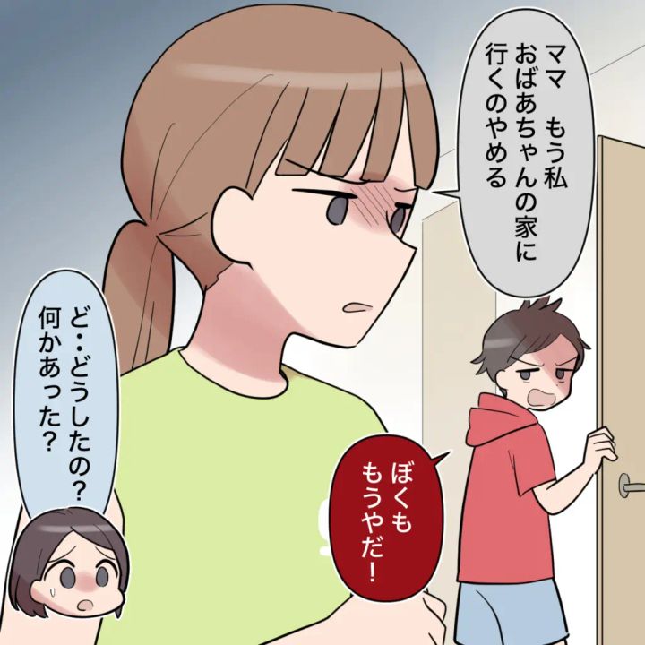 そして家に着くと、「ママ。もう私おばあちゃんの家に行くのやめる」「ぼくももうやだ!」と言い出す子ども達に、「ど・・どうしたの?何かあった?」とたずねると、