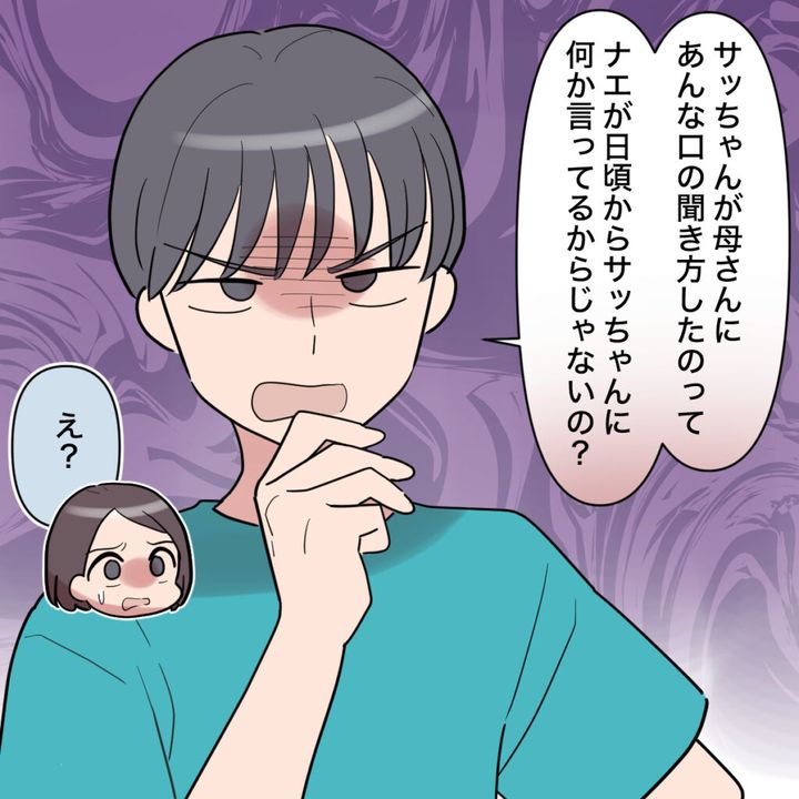 「サッちゃんが母さんにあんな口の聞き方したのって、ナエが日頃からサッちゃんに何か言ってるからじゃないの?」と怖い表情で言い出し、思わず「え?」と聞き返すと、
