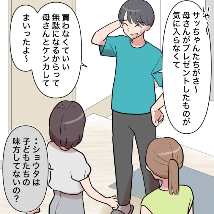 「いや~、サッちゃんたちがさ~、母さんがプレゼントしたものが気にいらなくて、買わなくていい無駄になるからって母さんとケンカして。まいったよ~」と言うショウタに、「・・ショウタは子どもたちの味方してないの?」と聞くと、