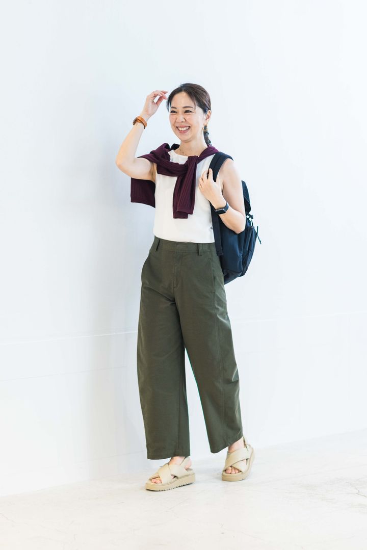 「子どもとのおでかけは、できるだけストレスフリーなものを選びたい。トレンドのバレルレッグパンツは、締め付け感がないコットンブレンドジャージー素材で楽な履き心地です。真っ白なトップスはレフ版代わりになるので、思い出の写真も顔映えしそう。日焼けや冷房の防寒対策にもなるカーディガンを肩掛けして、家族と万博におでかけしたいです。」