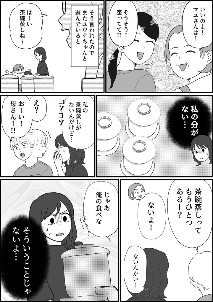 <義母&義妹⇒イジワル!>私の茶碗蒸しは!?義母の嫌がらせと夫の対応にイライラ…【まんが】