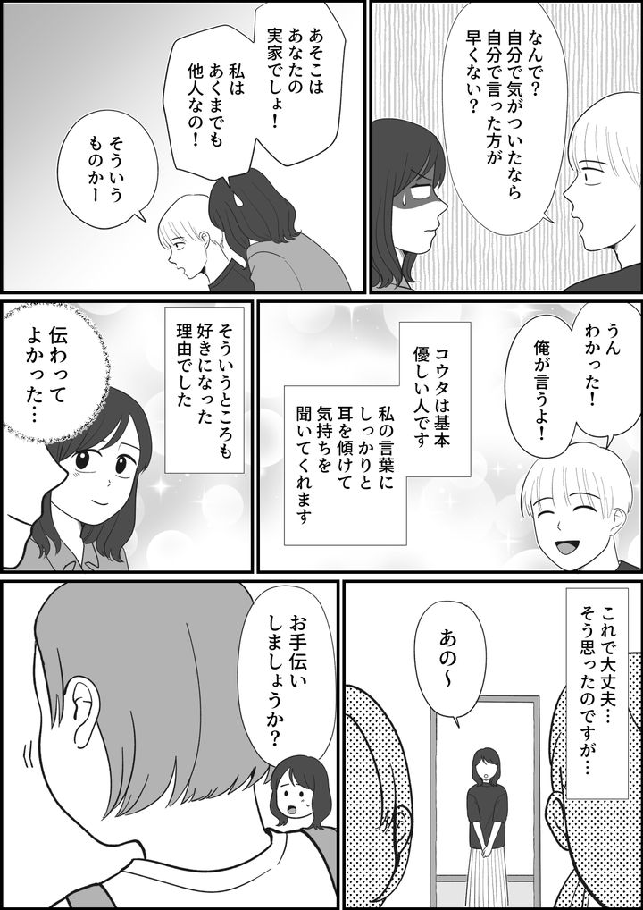 はじめ夫は「なんで? 自分で気が付いたなら自分で言った方が早くない?」と言っていました。しかし、あそこは「夫の」実家であって、私はあくまでも他人です。義母は夫からしたら母親かもしれないけれど、私からしたら他人なのです。私が説明すると、夫は理解してくれたようでした。