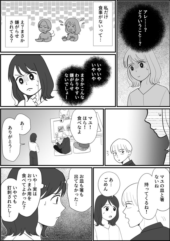 今日のお食事会では、私の分のお皿も箸も用意されていませんでした。しばらく自分の置かれている状況に頭がついていきませんでした。ことの真相はよく分かりませんでしたが、ひとまず食事にはありつけたのでよかったです。帰宅してから夫に話しました。