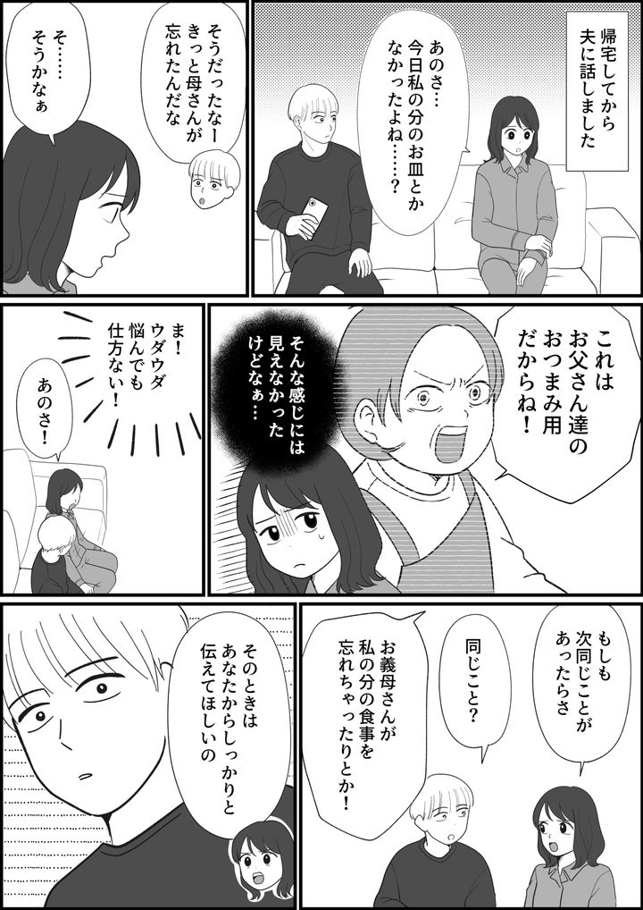 すぎたことをいつまでも考えていても仕方ありません。切り替えていかなければ! そう思い、私はもし次、同じことが起きたら、夫には「お義母さんが私の分の食事を忘れちゃったりしたら……あなたからしっかりと伝えてほしい」と、お願いしました。