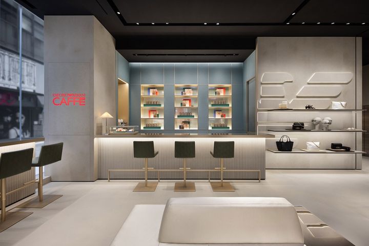 1階にはアクセサリーや時計、ジュエリー類をはじめ、バーカウンターを備えた「エンポリオ アルマーニ カフェ」も併設。2階にウィメンズ、3階にメンズのウェアが展開され、機能性と洗練が共存する構成となっている。特に、1階と2階をつなぐ階段はアルマーニ自身のデザインによるもので、モダンな禅庭を思わせる静謐な存在感を放っている。