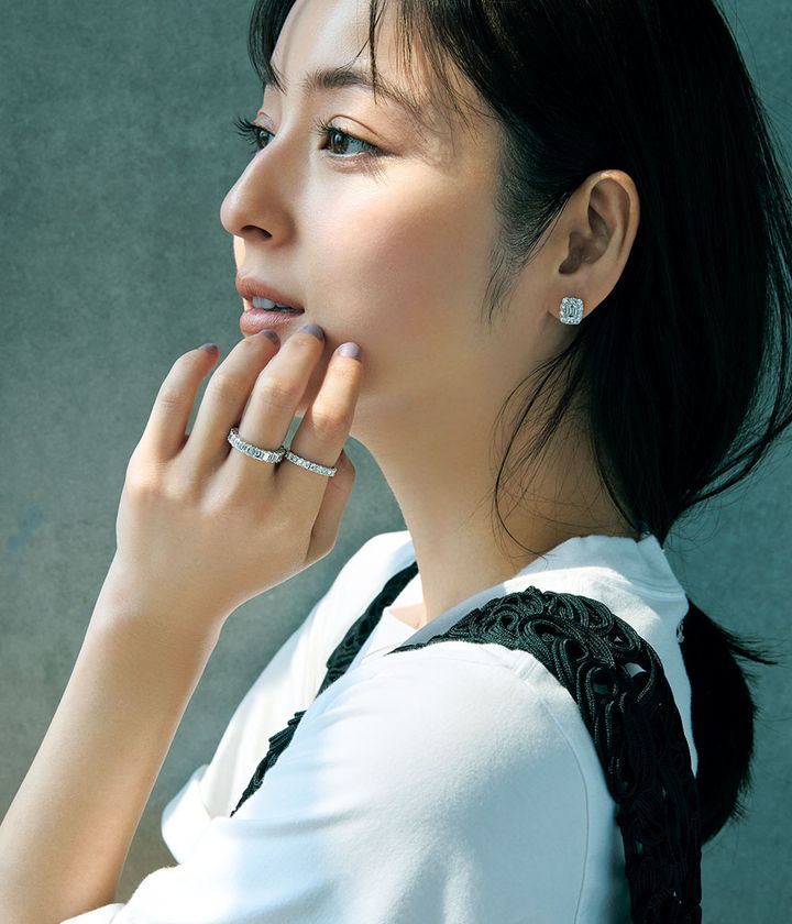 「アイコン」ピアス[WG×DIA]¥2,430,000「クラシック グラフ」リング〈中指〉[PT×DIA]¥3,328,000同リング〈人さし指〉¥1,094,000(すべてグラフ/グラフダイヤモンズジャパン)Tシャツ¥15,400(ロエフ/エイチ ビューティー&ユース)ビスチェ¥29,700(イウエン マトフ/ユナイテッドアローズ 渋谷スクランブルスクエア店)