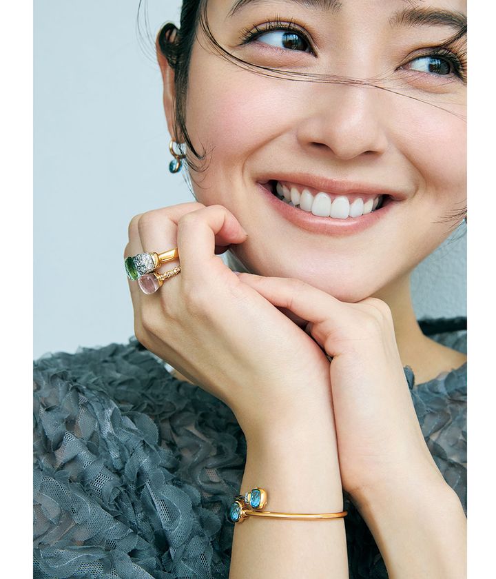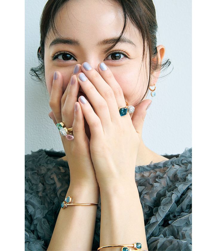 ピアス「ヌード」[RG×スカイブルートパーズ]¥473,000【左手】同ブレスレット[RG×WG×ロンドンブルートパーズ×DIA]¥814,000リング[RG×WG×ロンドンブルートパーズ×DIA]¥1,199,000【右手】同リング〈上〉 [RG×WG×プラシオライト×DIA]¥1,067,000同リング〈下〉[RG×WG×ローズクォーツ×カルセドニー×ブラウンDIA ]¥462,000同ブレスレット [RG×スカイブルートパーズ×DIA]¥748,000(すべてポメラート/ポメラート クライアントサービス)トップス¥24,970(エイチ ビューティー&ユース)