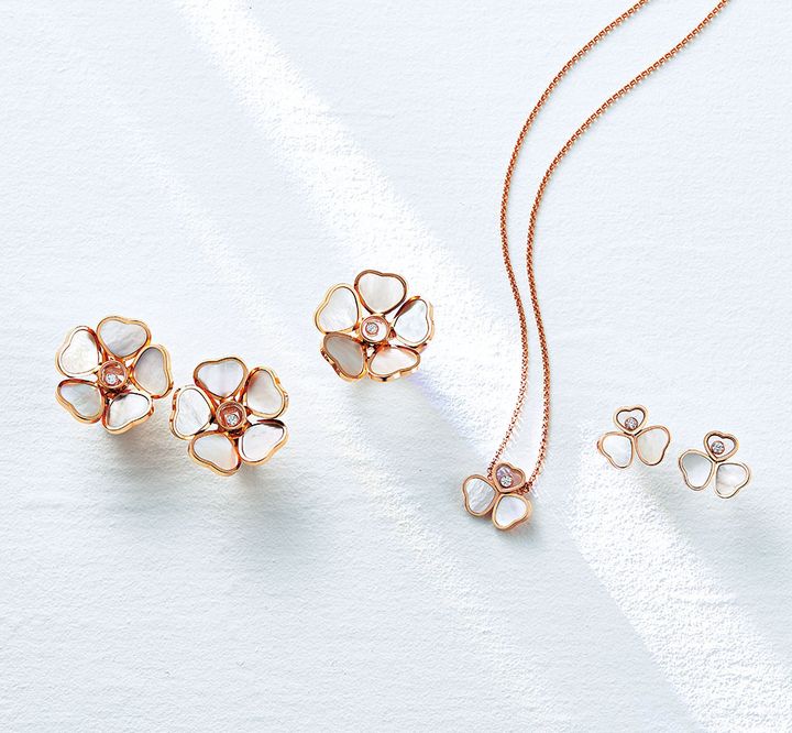 左から_「ハッピーハート フラワー」イヤークリップ[RG×MOP×DIA]¥1,287,000同リング[RG×MOP×DIA]¥632,500「ハッピーハート ウィング」ネックレス[RG×MOP×DIA]¥456,500同ピアス[RG×MOP×DIA]¥577,500(すべてショパール/ショパール ジャパン プレス)