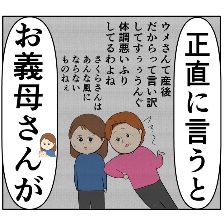 長男の嫁ウメさんに対する愚痴を義母からずっと聞かされていたさくらさんは、つい「お義母さんは嫁の事を気にしすぎです」と義母に指摘。この日、寝不足と産後のホルモンバランスの乱れが重なっていたさくらさんは、勢い余って「お義母さんが私をコントロールしようとしているように感じてしまって気分のいいものではありません」と思っていても言えなかったことをはっきり言ってしまいました。