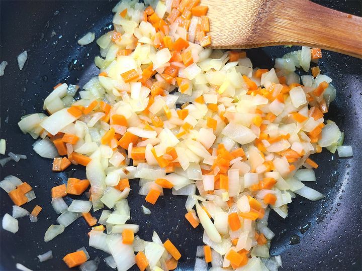 3. フライパンにサラダ油を引き弱火で熱し、玉ねぎとにんじんに塩ひとつまみ(分量外)をふってじっくり炒めます。
