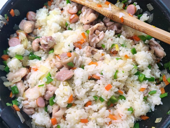 6. ご飯を加え、味をみながら塩(分量外)、黒こしょうをふってほんのりと味がつくくらいに調えます。