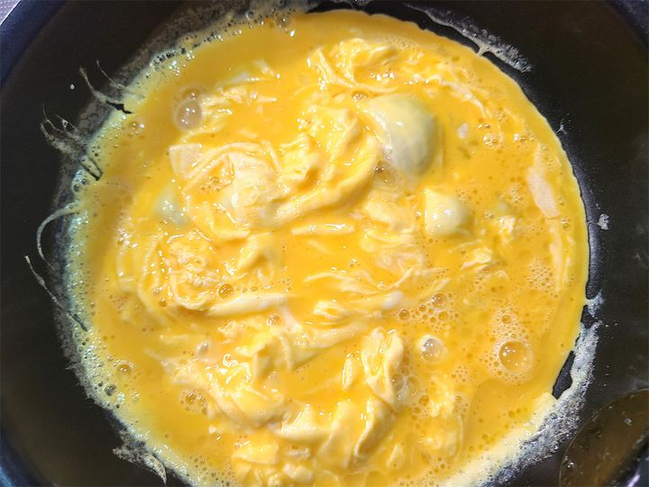8. 大きめのフライパンにサラダ油大さじ1(分量外)を引き、強めの中火で熱し、溶いた卵を流し入れて広げます。卵の縁が固まってきたら菜箸で大きく混ぜ、半熟状になったら火を止めます。