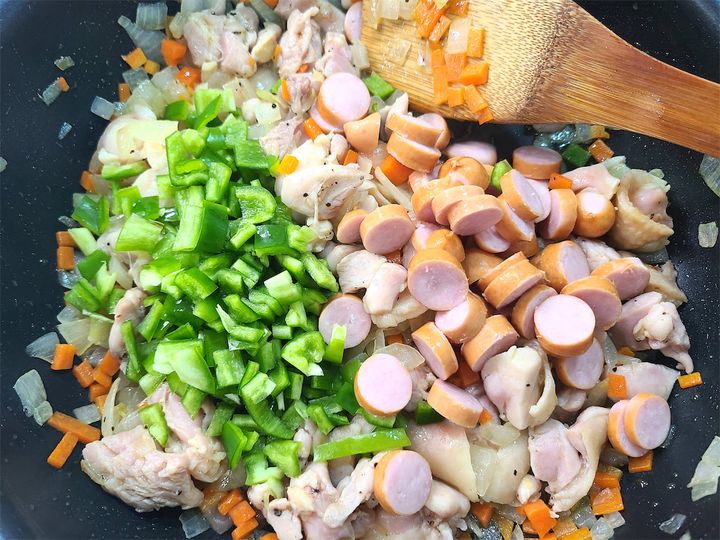 5. 鶏肉に火が通ったらウインナー、ピーマンを加えてサッと炒め合わせます。ピーマンは食感と風味を生かしたいのでサッと炒めるのがコツです!