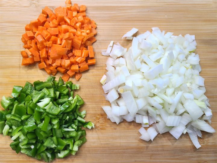 1. 玉ねぎ、にんじん、ヘタと種を除いたピーマンは1cm角に切ります。
