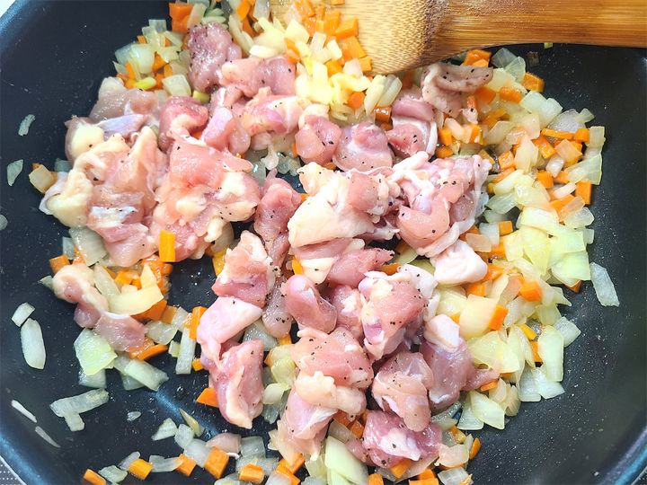 2. ウインナーソーセージと鶏もも肉も1cmほどの大きさに切り、鶏肉には塩小さじ1/2と黒こしょうをふっておきます。