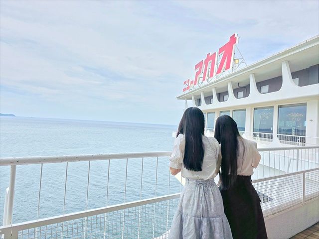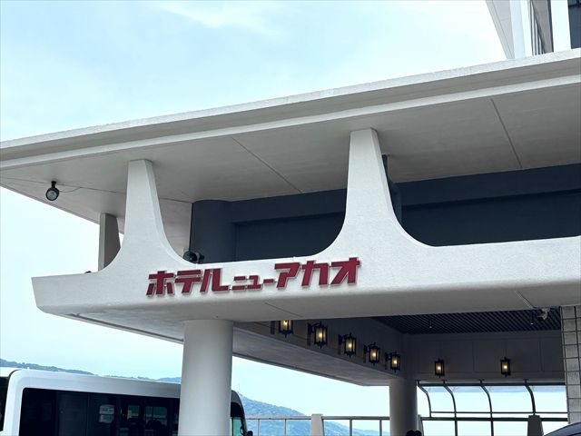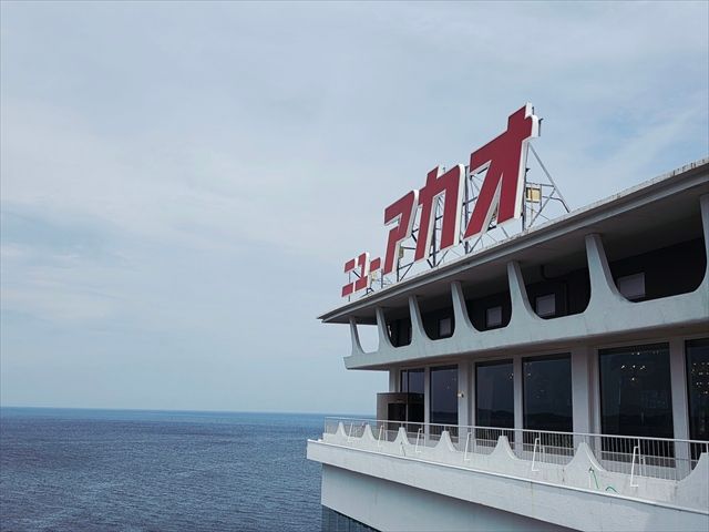 ホテルニューアカオのロゴが見えるテラスは、ホテル公認の撮影スポット。記念写真にもぴったりの人気スポットです。このロゴを撮影する際のポイントは、海を一緒に映すこと。さらに、スマホの望遠モードを使って画角を調整すると、ロゴと海がバランスよく収まります。