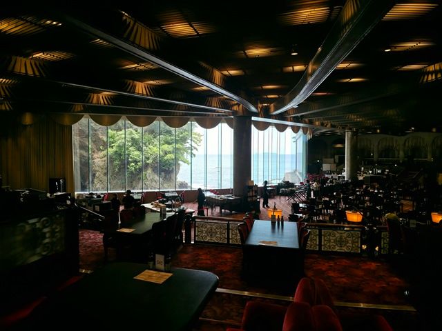 ホテルニューアカオ・オーシャンウィングの2階にある「メインダイニング錦」は、レトロで豪華な内装がとっても素敵です! 思わず写真を撮りたくなる空間が広がっています。