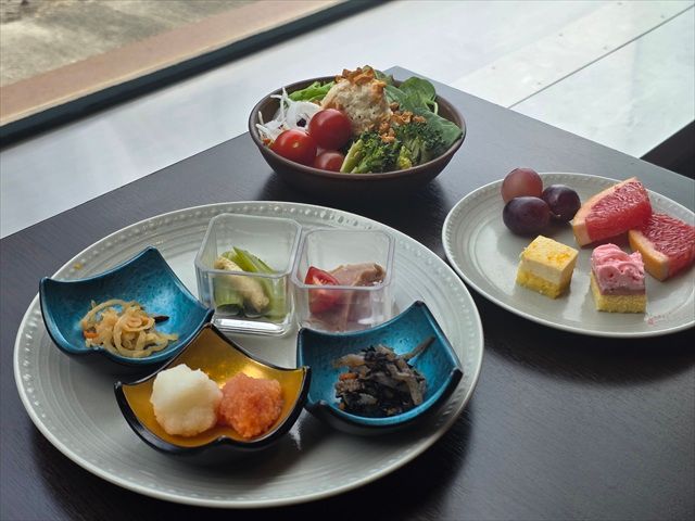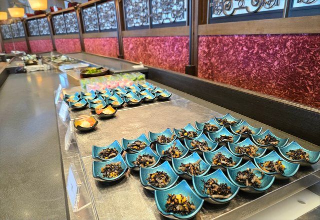 メインダイニング錦はビュッフェスタイル。お惣菜や小皿料理、サラダ、デザートまでずらりと並び、選ぶだけでもワクワクします!