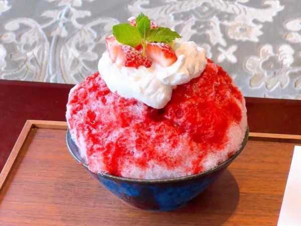 ふんわりと削られた氷に、甘酸っぱい苺ソースとホイップクリームがたっぷり。上にはフレッシュ苺がトッピングされ、可憐な見た目に心が華やぎます。