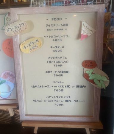 ベトナムコーヒーゼリーやオリジナルパフェ、フランスパンに具材を挟んだバインミーなどがありました。 手作りのPOPもかわいい♪