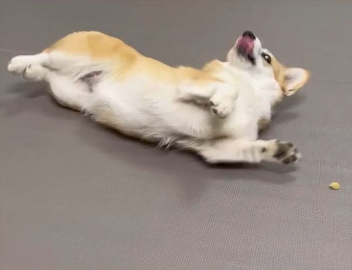 3. 横着が失敗したコーギー。おやつが食べられなくてジタバタする様子に「取れないー!って怒ってるの、最高にかわいい」