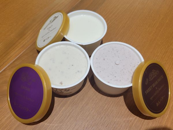 バターアイスと聞くと濃いそうだなと思いましたが、驚きのさっぱり感! 塩バター、あんバター、キャラメルバター、レーズンバターの4種。