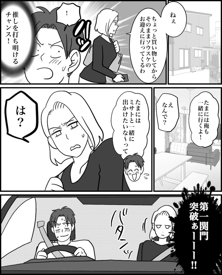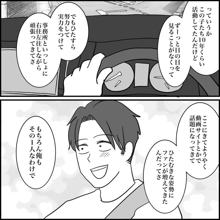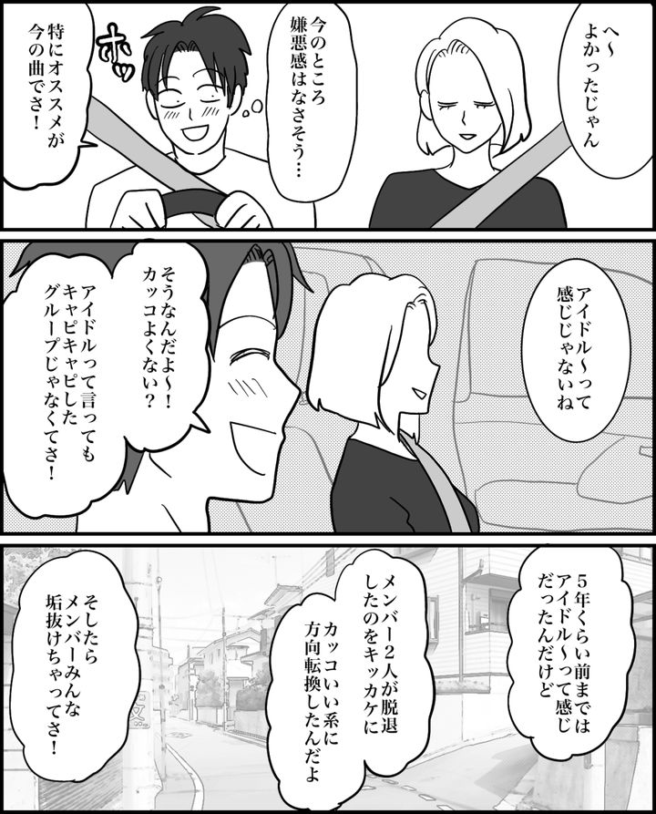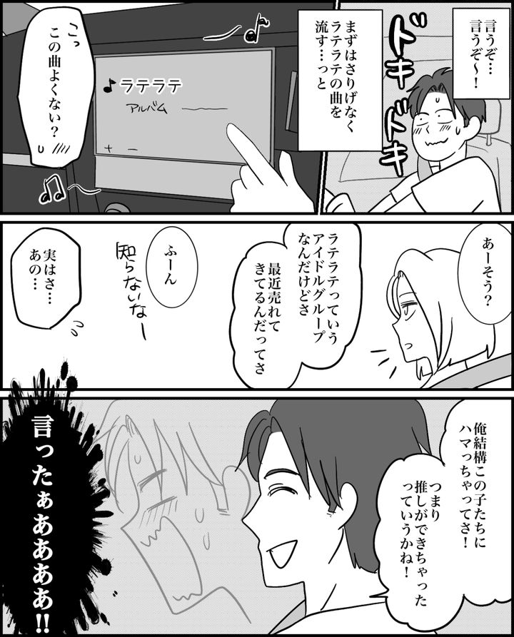 ミサトが車で出かけると言うから、話を切り出す絶好のタイミングだと思った俺。事前に練っていた作戦どおり、自然な流れで音楽を聞かせることに成功しました。そして意を決してミサトに打ち明けたところ、「よかったじゃん」という声が。特に嫌悪感を抱かれているわけではなさそうです。よっしゃー! このまま一気に、推しの魅力を伝えてしまおう……。
