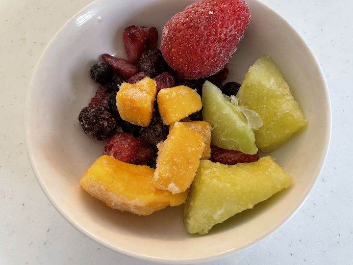 昼は忙しいこともありつまみ程度で軽く済ませています。フルーツ、ナッツ、ダークチョコレートにはがん予防効果があり、かつつまみやすい。毎日フルーツを必ず、ボウル1杯弱いろいろな種類で食べられるように、購入した時に冷凍。ぴぃきち堂の「素煎りミックスナッツハイカカオチョコ入り」は、食べきりサイズの小袋がベストバランス。70%のハイカカオで、1日200㎎以上摂取が目安と言われているカカオポリフェノールも93㎎摂取できます。
