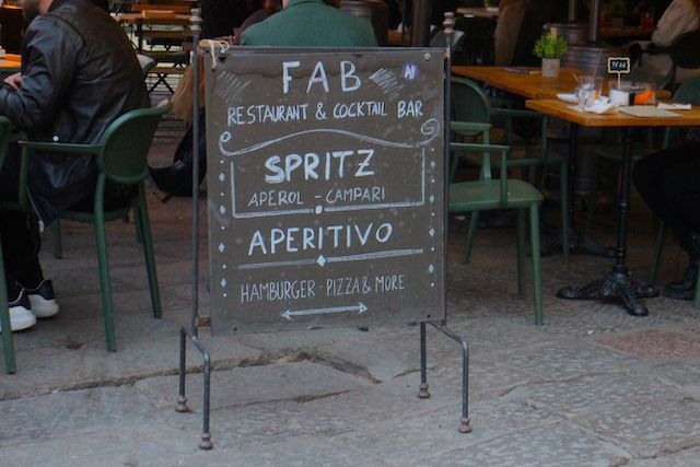 運河沿いや、路地のレストランでしたいのがアペリティーボ。アペリティーボとは、元は食前酒という意味ですが、ディナー前の夕方頃にバールにお酒と軽食を食べることを指します。いわゆるハッピーアワーに近いイメージです。