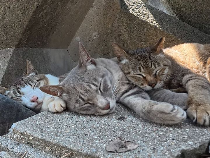 3. 夏の堤防の定番スポット? 猫たちが選んだ完璧な昼寝場所