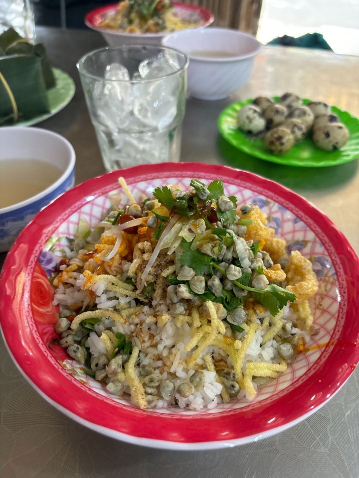 ご飯だけでなくブンヘン(Bún hến)=米麺、ミーヘン(Mì hến)=インスタント麺、という麺バージョンもあり。ちょっとジャンクなインスタントの味わいがこの料理には不思議と合うので、私はミーヘンも推しです!