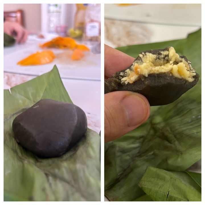 ラストはおやつ。ガイ(Gai)という葉で色付けした餅菓子です。中身は緑豆を使ったあんこ。草だんごのような味わいで、日本人にとってはホッとする一品なんです。街中で売っているお店はあまりないんですが、市場で購入することができます。散策中のおやつにどうぞ。