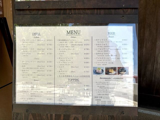 ほかにも、名前に思わずクスッとしてしまう「阿夫利神社のジンジャー」や、ふわふわでおいしそうな「シフォンケーキ」などがありました。なお、提供されているのはドリンクとスイーツのみで、食事系のメニューはありませんのでご注意ください。
