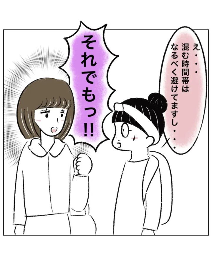 まるさんは戸惑いながら「え・・混む時間帯はなるべく避けてますし・・」と返しますが、ゆかちゃんママはそれを遮るように強い口調で「それでもっ!!」