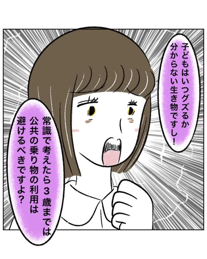 「子どもはいつグズるか分からない生き物ですし!常識で考えたら3歳までは公共の乗り物の利用は避けるべきですよ?」と、まるでまるさんが非常識かのように言いました。