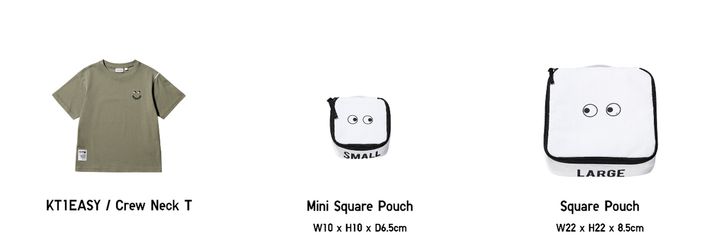 (左から)「KT1EASY/クルーネックT」(1,500円)、「ミニスクエアポーチ」(990円)、「スクエアポーチ」(1,500円)※すべて税込