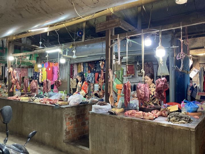 カンボジアのマーケットでは、肉が冷蔵されることなく、炎天下で剥き出しのまま売られていた。