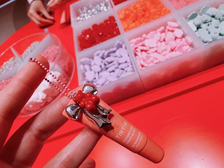 カスタードライクリキッドブラッシュを2本購入すると、6色の中から自分の好きな色のミニチークとチャームをカスタムできる自分だけのキーリングが作れちゃいます。私もさっそく作ってみました、こんな感じ! バッグチャームとして使っても可愛いと思います。