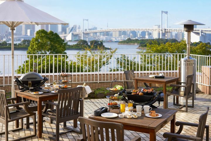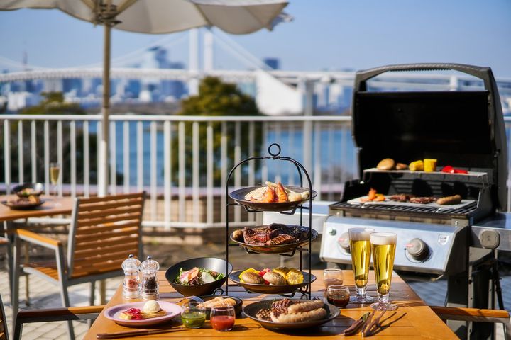 目の前にレインボーブリッジや東京タワーなどの眺望が広がる2階のテラスエリアでは、期間限定でバーベキューレストランがオープン!料理長が厳選した黒毛和牛やトマホークステーキ、新鮮な魚介など、ホテルならではの贅沢なメニューをいただきながアウトドアダイニング体験が叶います。