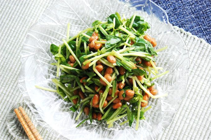 えんどう豆の新芽である豆苗は、豆類に多く含まれるたんぱく質やビタミンB群と、葉物野菜に多く含まれるβカロテンやビタミンCなどの栄養をあわせ持つ、緑黄色野菜。そして納豆は、たんぱく質、ビタミンB群、ビタミンE、亜鉛、鉄などが含まれた、日本が誇る伝統的な発酵食品。ということで、この豆豆コンビは、栄養面もバッチリなんですよ。
