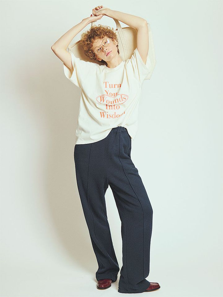 目のつまったネイビーにセンターシームを入れた、スラックスのようなディテール。肉感を拾わないストレートなフォルムで、部屋着感なくONの予定にも穿いていけるルックスに。装飾を省いたデザインに、すとんと縦に落ちる素材感も美形な所以。