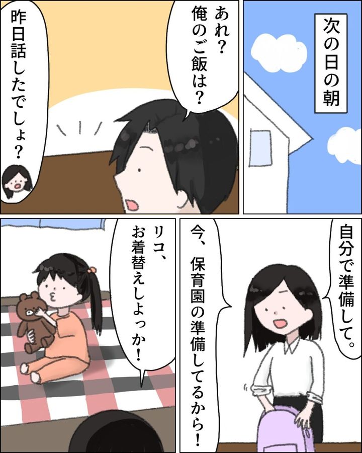 「あれ?俺のご飯は?」と言うカズヒデに、「昨日話したでしょ?自分で準備して。今、保育園の準備してるから!」そう言い返した後、「リコ、お着替えしよっか!」とリコに声をかけました。