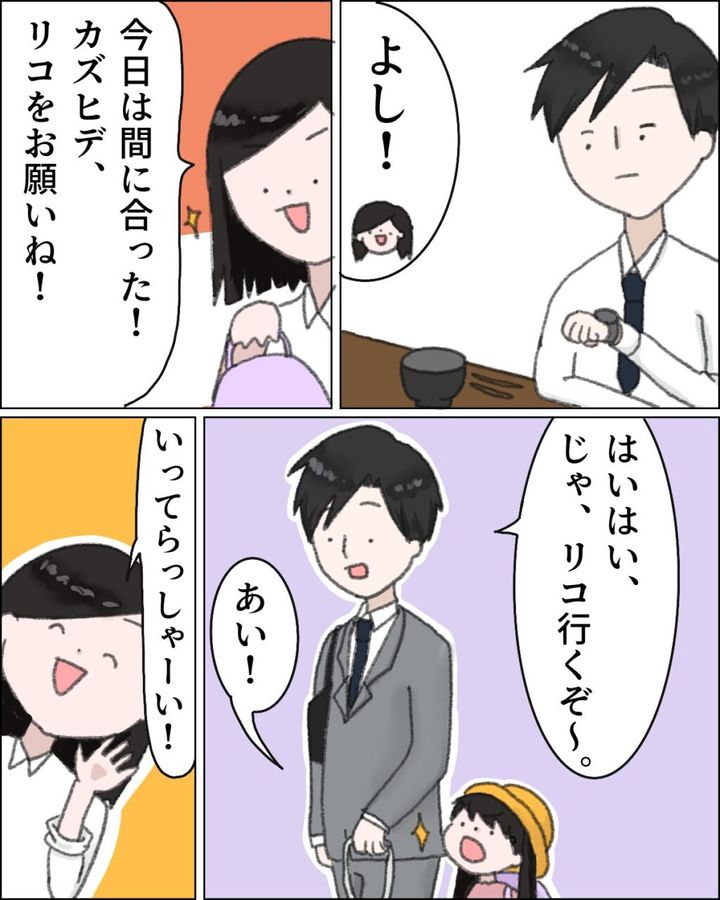 そして、「よし!今日は間に合った!カズヒデ、リコをお願いね!」と言うと、「はいはい、じゃ、リコ行くぞ~」とリコに声をかけるカズヒデと、「あい!」と返事をしてついていくリコに、「いってらっしゃーい!」と笑顔で声をかけ見送ることができました。