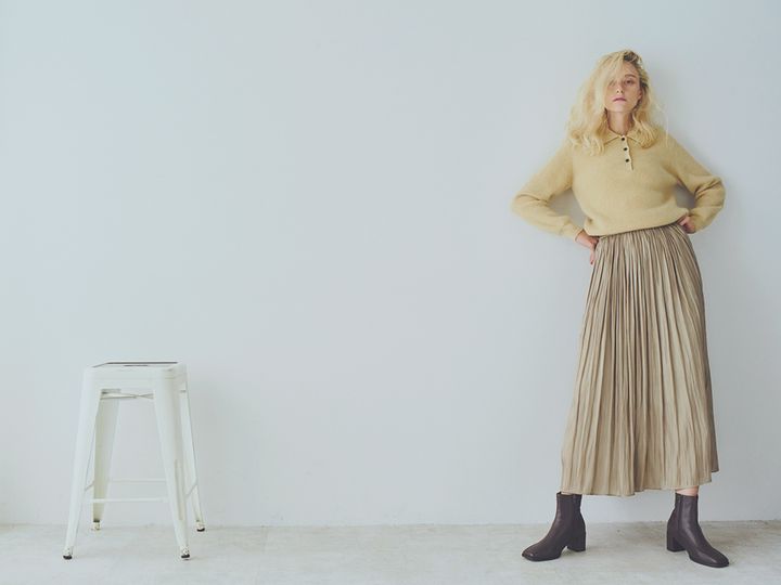 ゴールドスカートと同系色感覚で使える、ベージュ寄りのイエローニット。マイルドな色みによって配色パターンを力まず広げられる。細かなプリーツデザインが、やさしいトーンのメリハリづけに作用。