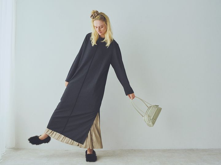 動きが出やすい薄手のプリーツスカートをアクセントに、ウールワンピースを軽やかな表情へ誘導。