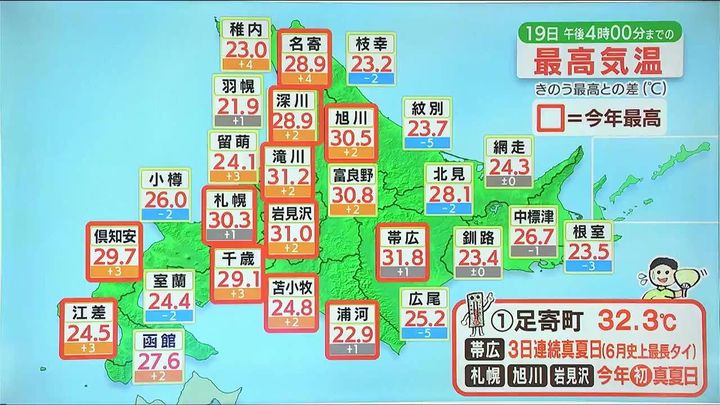 午後4時までの最高気温は、最も上がった十勝の足寄町で32.3度でした。帯広は31.8度で、3日連続30度以上の真夏日。6月に3日も真夏日が続くのは、観測史上最長タイ記録です。赤枠の札幌や旭川、岩見沢は今年初めて真夏日になりました。