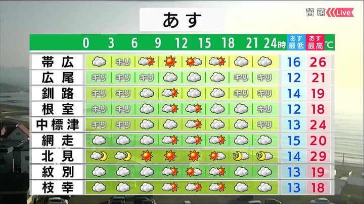 海岸部は低い雲や霧がかかりやすく、空気が少しムシムシするでしょう。内陸は晴れて北見では29度と暑さが続きます。帯広は26度で厳しい暑さは少しおさまるでしょう。