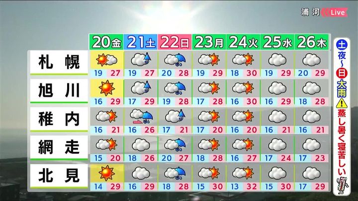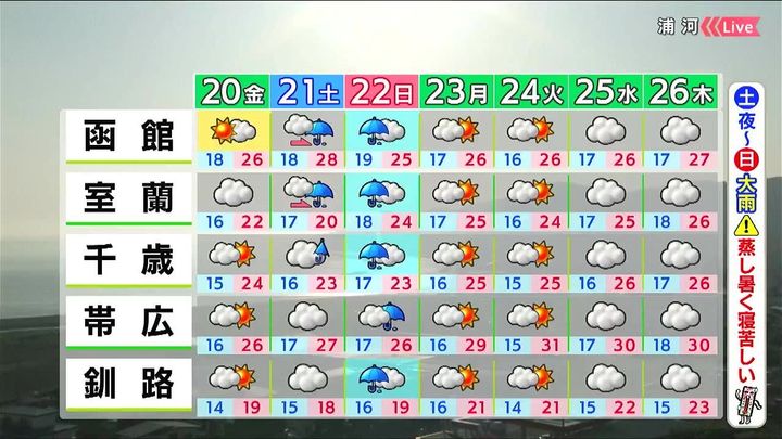 土曜の午後は道南から雨が降り、日曜にかけて大雨になります。土日はムシムシ・ジメジメするでしょう。来週月曜火曜は日差しが出て、火曜は帯広で31度まで気温が上がります。